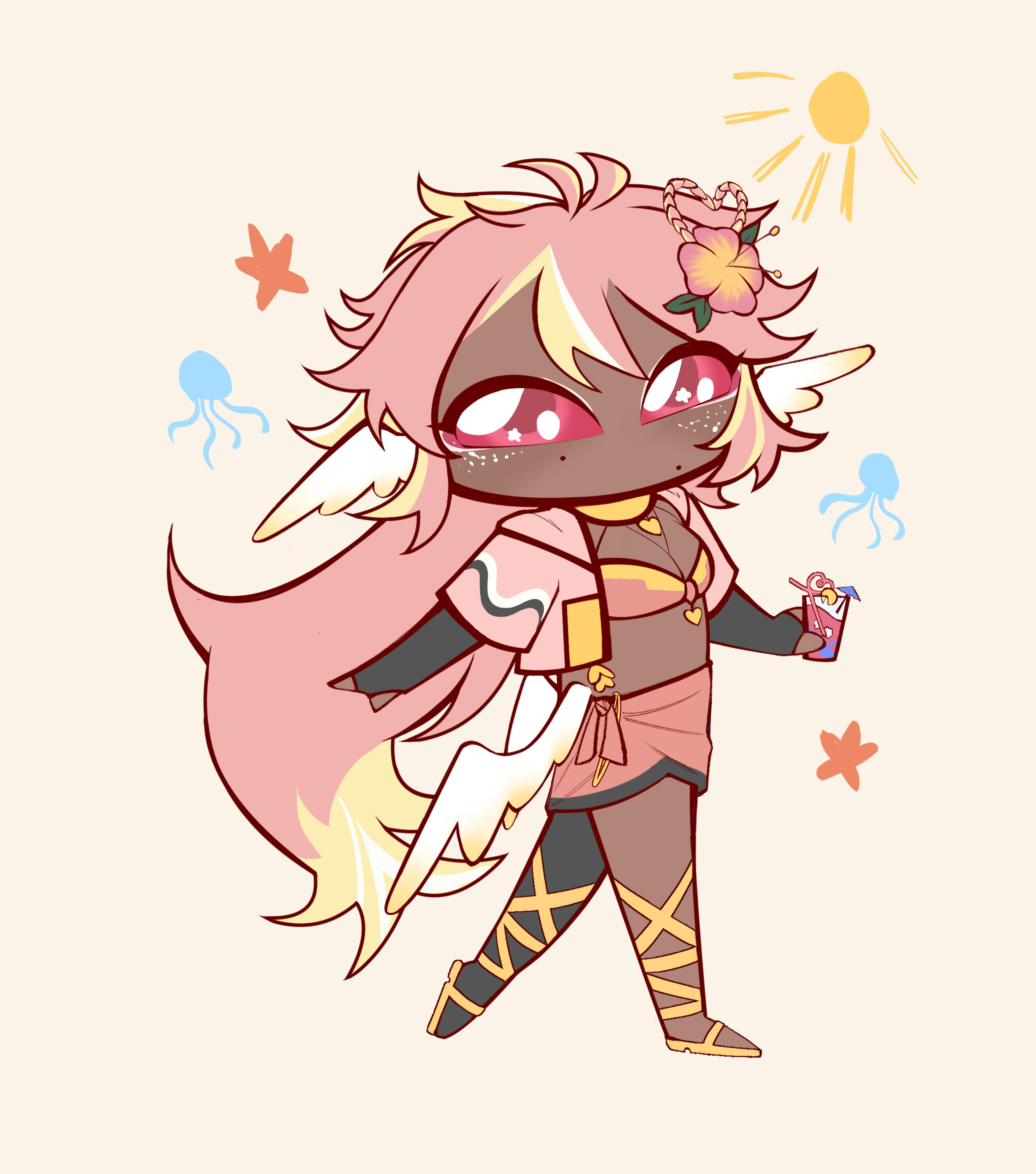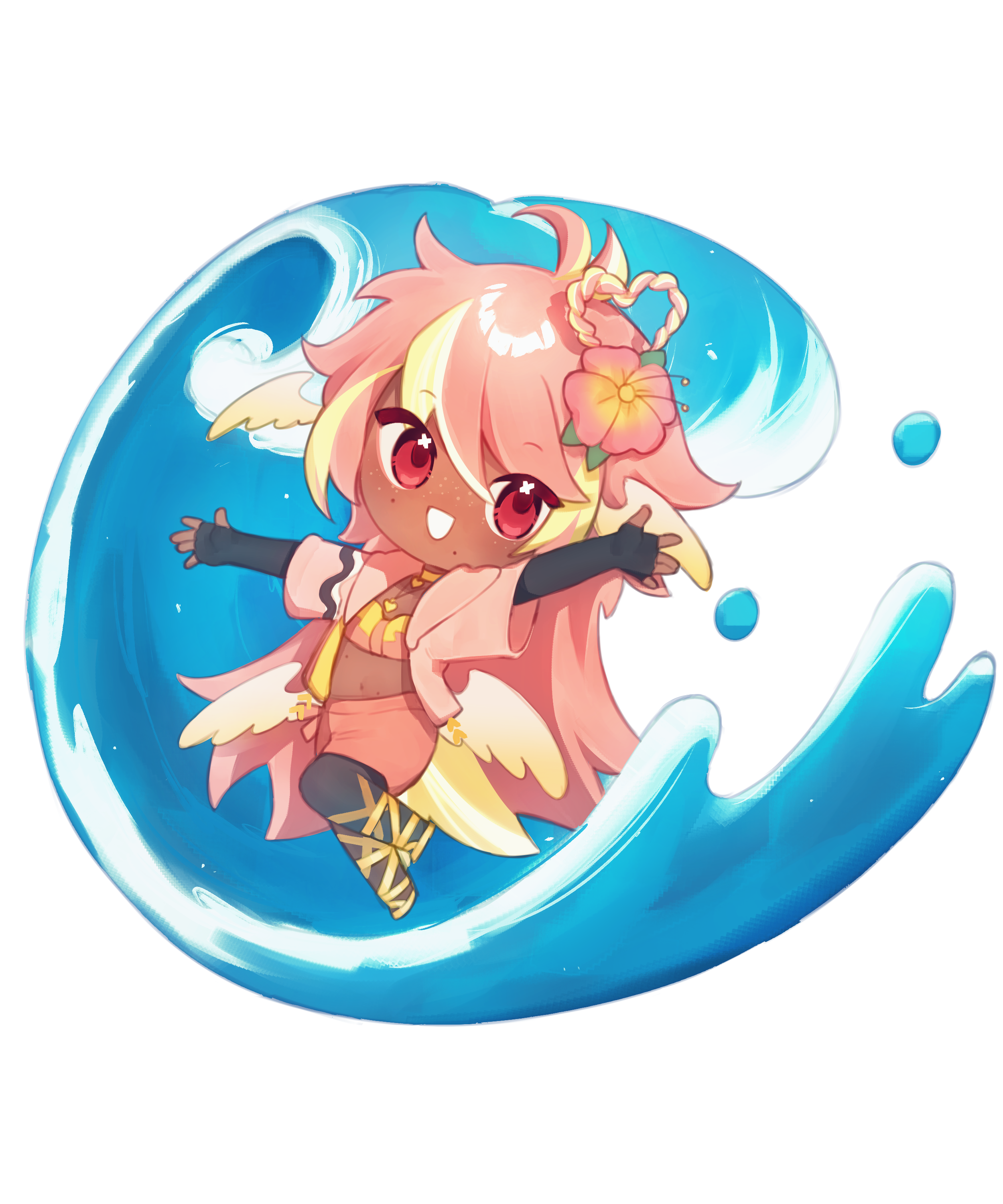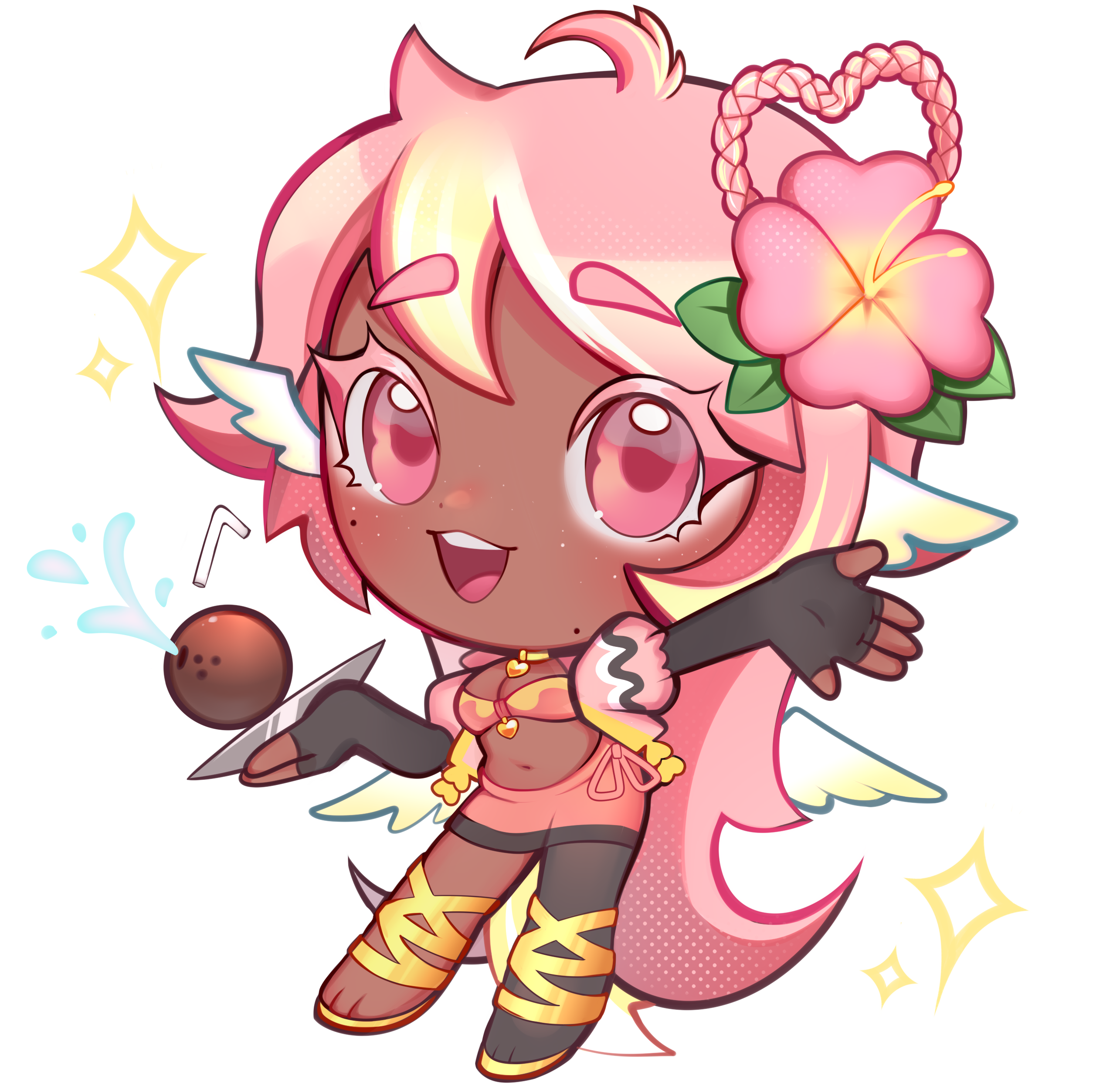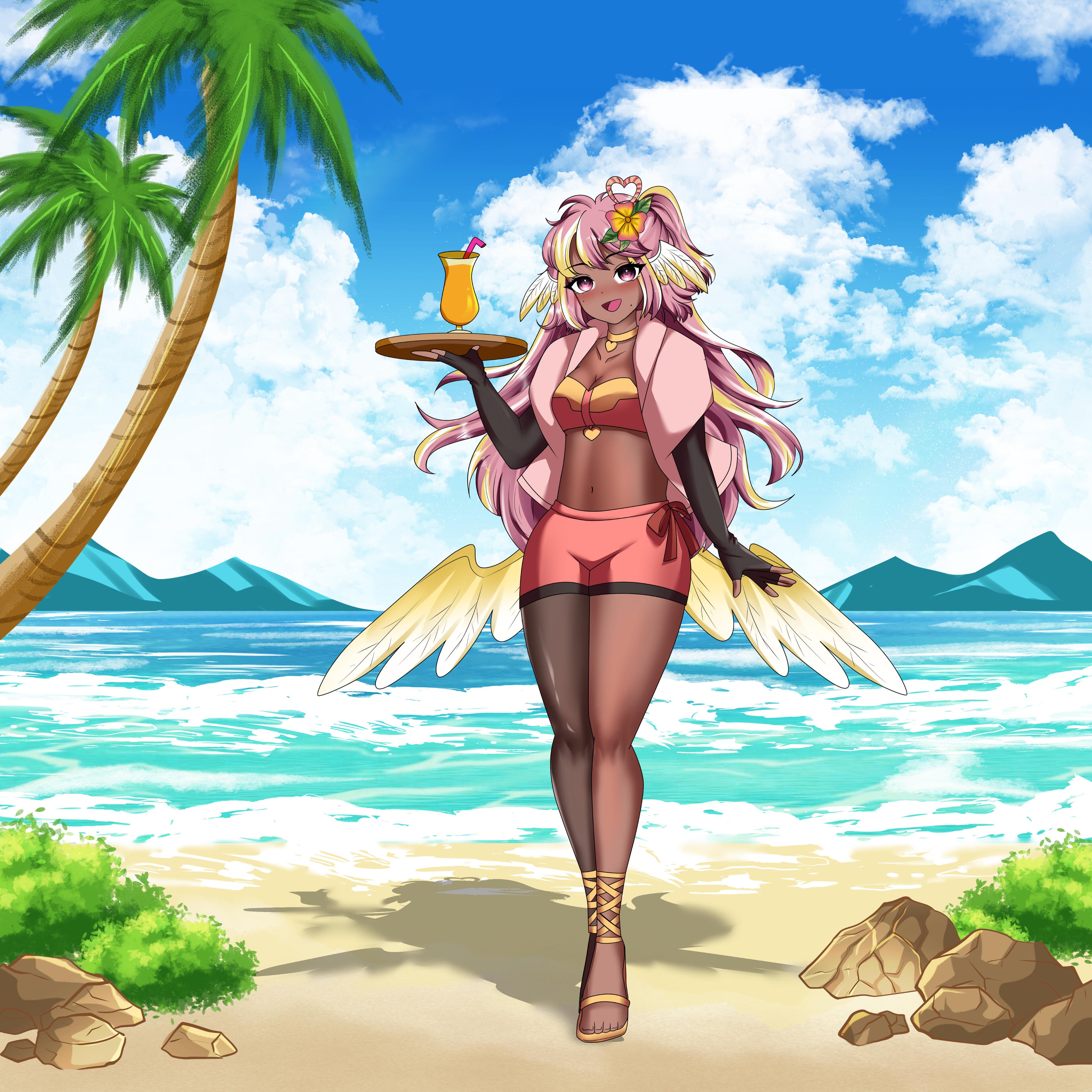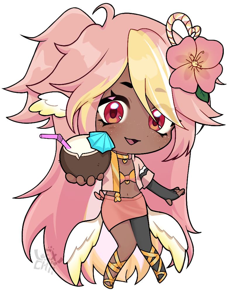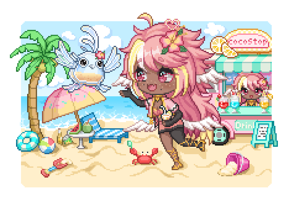 Pai is an angel from a country called Haven, she was born and raised in a small beach town by the border named Paradise. When a war broke out in her country, Pai’s town was one the first affected by the chaos and destruction caused by the neighboring country, Infinite. After losing part of her family and home she decided to join her people’s military with her sister and was bestowed a Stellar. A Stellar is a special symbol of power, which is marked as a star symbol on her hand; these Stellar’s also power special towers of protection that fell during the war called Scepters. She went on to contribute much to the cause but lost her remaining loved ones in the process. With the Scepter near her home being restored, she returned to her town and started the Cocostop as a way to bring hope and happiness; she now spends her time enjoying life to the fullest.Pai will never forget how terrifying her past was, she cherishes every moment of everyday life and faces each morning with a positive attitude. She is compassionate and kind, looking to bring a smile to each person’s face.