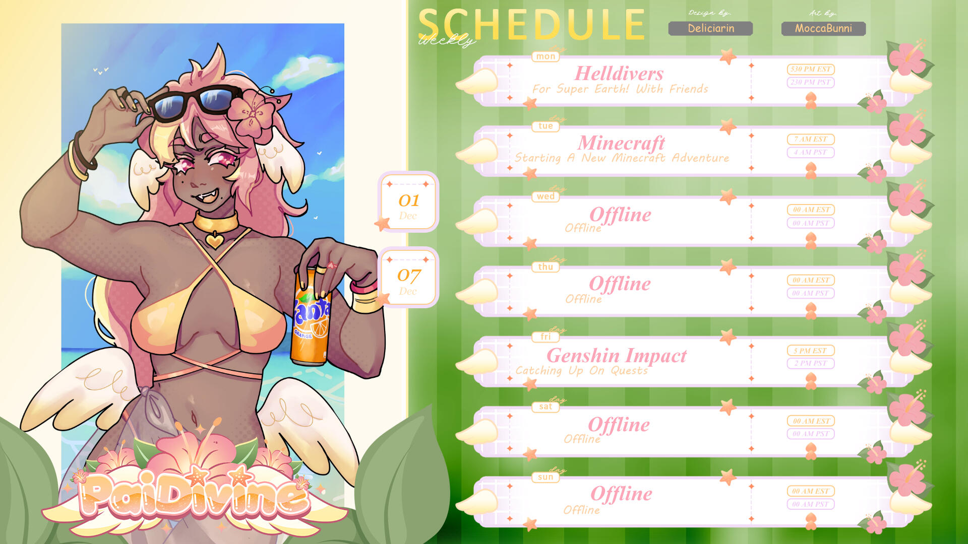 I'm Pai Divine your seaside angel girlfriend. I enjoy making new friends, walks on the beach, baking, gaming and more. I'm glad you decided to take a look at my Carrd today to find out more about me. I am an aspiring VTuber, Streamer and YouTuber who wants to make content to make other people smile. I love to see you everyday and spend time together, I want to spend time with you and get to know what you love! I like a variety of games and I am always willing to branch out and find more to play. I also enjoy a lot of indie shows and animation. I run a small gift shop and diner known as the Cocostop where I serve all types of delicious food, why don't you stop by sometime?